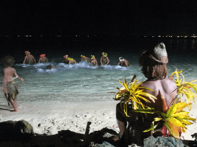 Liberally dosed with mozzie repellant we made our way down to the beach for a warrior’s welcome while the grass-skirted women waded out into the lagoon.